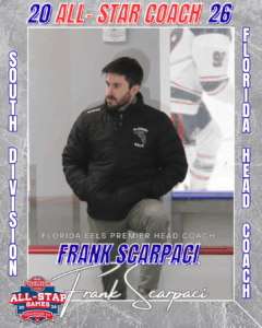 Leading the charge behind the bench, Florida Eels Premier Head Coach has been named the South Division Florida Coach for the All-Star Event — a testament to the high level of coaching, leadership, and competitive excellence being built in Fort Myers. Scarpaci, has been at the helm of the Eels Premier team for over a decade, bringing for tremendous amounts of passion, drive and knowledge to his players. Scarpaci, has continued to produce teams that have served center stage at the USPHL Nationals, at a competitive level. His incredible drive, tenacity is unmatched and has propelled him to new heights most recently taking on the role of General Manager in addition to his Premier Head Coach status.