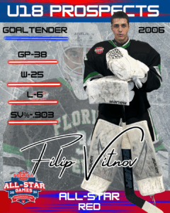 Between the pipes, Eels Premier Goaltender Filip Vitanov continues to turn heads on the national stage, earning selection as the U18 All-Star Prospects Red Team Goaltender, further highlighting the Eels’ commitment to player development and advancement. Vitanov second year veteran for the Eels organization, moved up to the Premier team this season, after playing on the Elite team last season. Vitanov has been steady and consistent in his play between the pipes throughout the season. Vitanov, an 07’ Goaltender continues to demonstrate skill, development and commitment through his training, and his playing style.